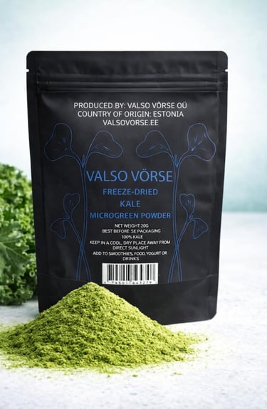Kale microgreen powder has a mild, slightly earthy and gently cabbage-like flavor with soft green notes, offering a clean and balanced taste that is not overpowering; it works well in smoothies, salads, soups, sauces, pasta dishes and as a finishing touch on warm meals, adding depth and a subtle green character